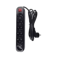 Черный сетевой фильтр 5 метров от "MAXIMUM QUALITY TOOLS" создан с 6 розетками и евровилкой. Корпус выполнен из черного негорючего АБС-пластика и подходит для использования только внутри помещений.